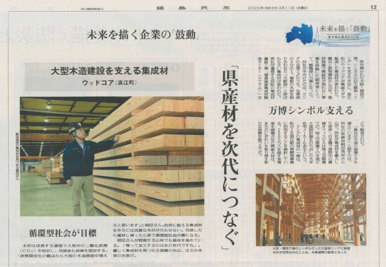 令和8年3月11日付、福島民友の特集記事「東日本大震災から15年」で、ウッドコア・FLAM工場について掲載されました。